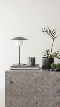The light cone and the light output can be changed by simply turning the lampshade of the Ani lamp. The luminaire can be placed on a stand, hung on a rope, or placed on a table. For recharging, the Ani lamp is placed on a charging cradle.