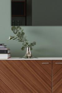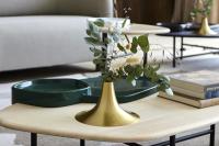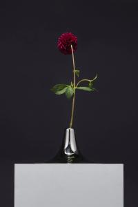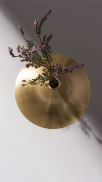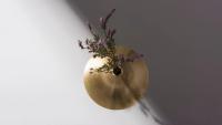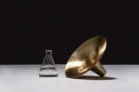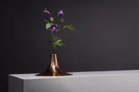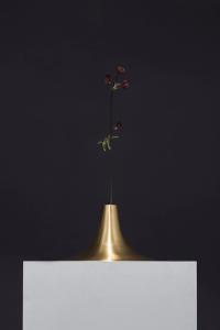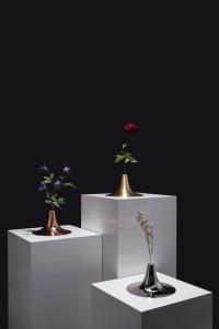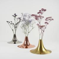 This vase was inspired by the shape of a trumpet, reflected clearly in its material and form. The vase is composed of two parts: a metal spun cover and a hand blown glass container below.